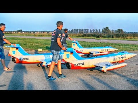 One of three huge rc starfighter jets crashed at start because of a turbine failure. Good news: nothing was really damaged. Model: 3x F-104G Starfighter Pilots: Red Bull Aerobatic Team (Robert Fuchs / Sebastian Fuchs / Tim Stadler) Location: Horizon Airmeet 2018, Donauwörth, Germany - Please subscribe for upcoming videos - Copyright: DIGITAL RC